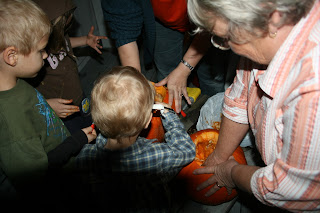 I was having a very hard time getting my knife into the pumpkin so he got his saw out and cut the top off. As you can tell from the pictures below, Riley and Josiah helped me clean the pumpkin.